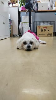 我が社のアイドルももちゃん🐶 毎日、川端社長と一緒にご出勤です♪ 今年で17歳(人間でいえば84歳です😃)のおばあちゃんですが、 食欲旺盛で、元気に走りまわってます!🐩✨